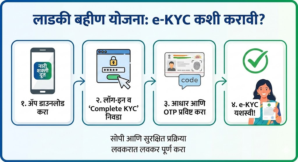 महाराष्ट्र शासनाच्या 'मुख्यमंत्री माझी लाडकी बहीण योजने'चा (Ladki Bahin Yojna) लाभ अखंडित मिळवण्यासाठी प्रत्येक लाभार्थी महिलेला e-KYC करणे बंधनकारक आहे. ही प्रक्रिया तुम्ही घरबसल्या मोबाईलवरून किंवा लॅपटॉपवरून सहज पूर्ण करू शकता.